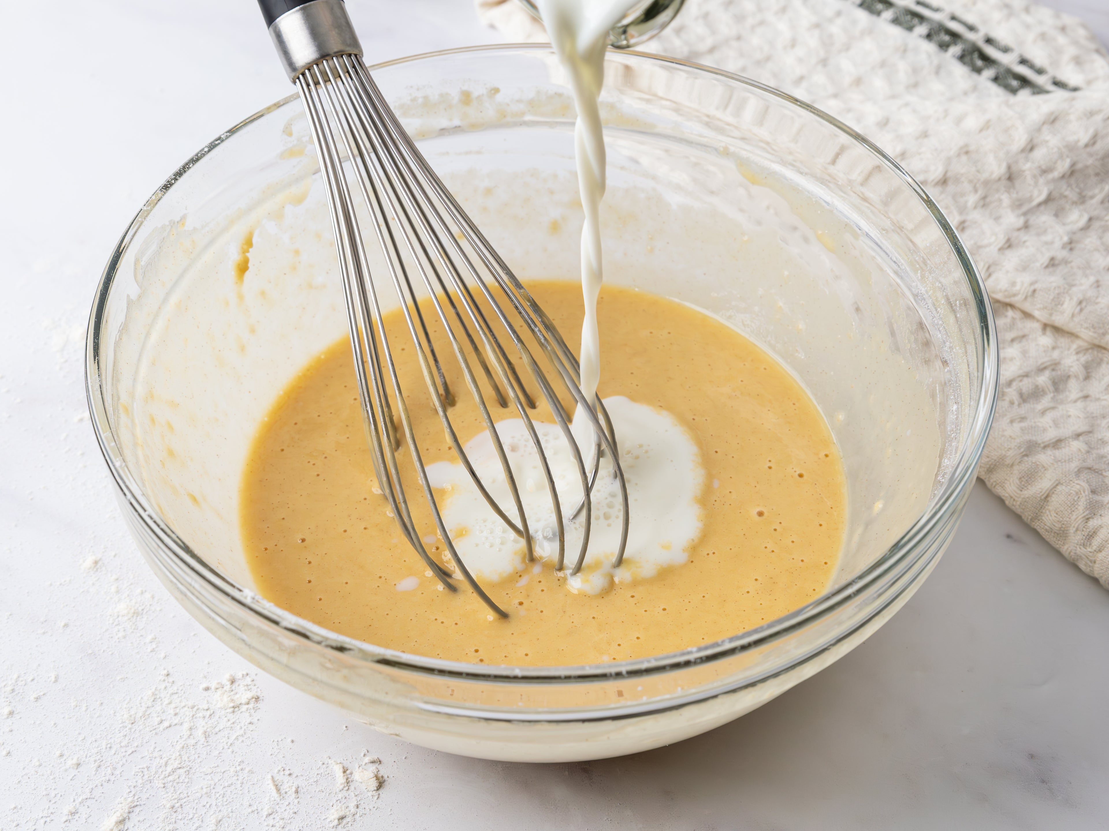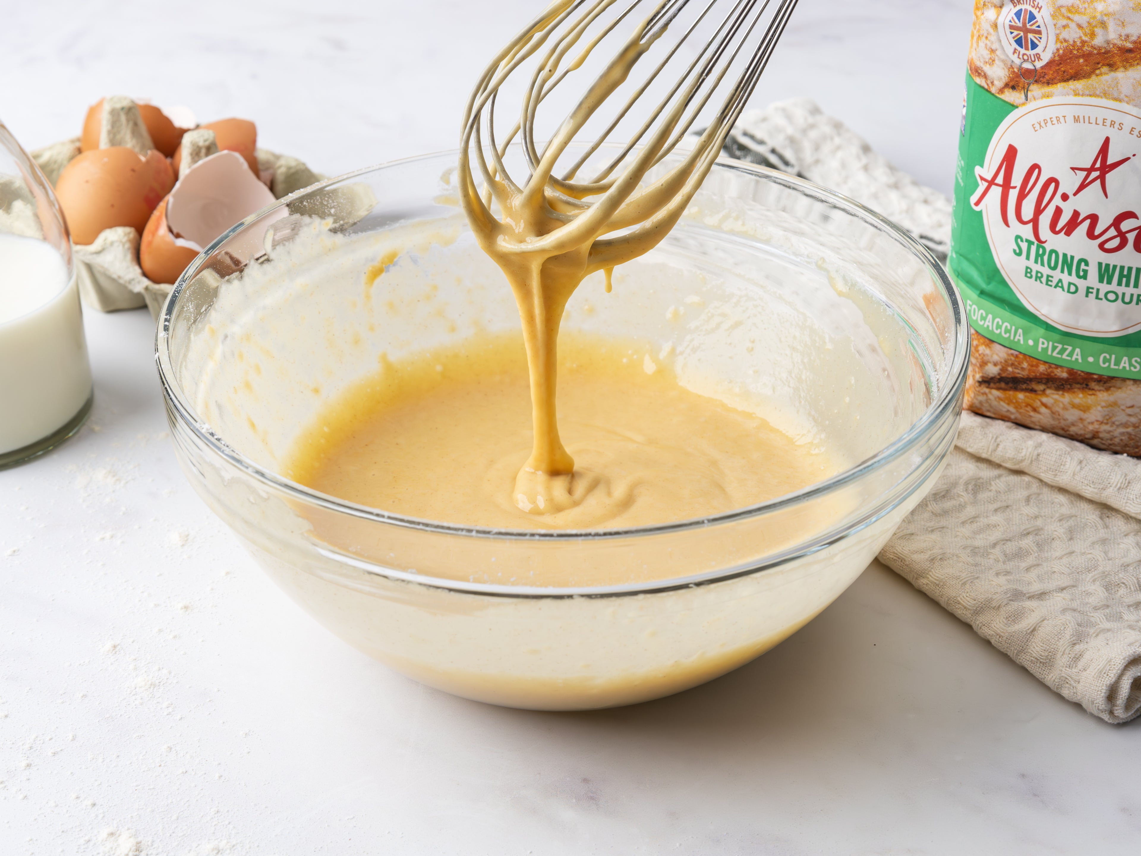 Gradually pour in 200ml of milk, beating continuously until the batter is completely smooth and lump-free. This step ensures the mixture is well-aerated, helping the Yorkshire puddings rise to their full, fluffy potential. Season with salt and pepper to enhance the flavour.