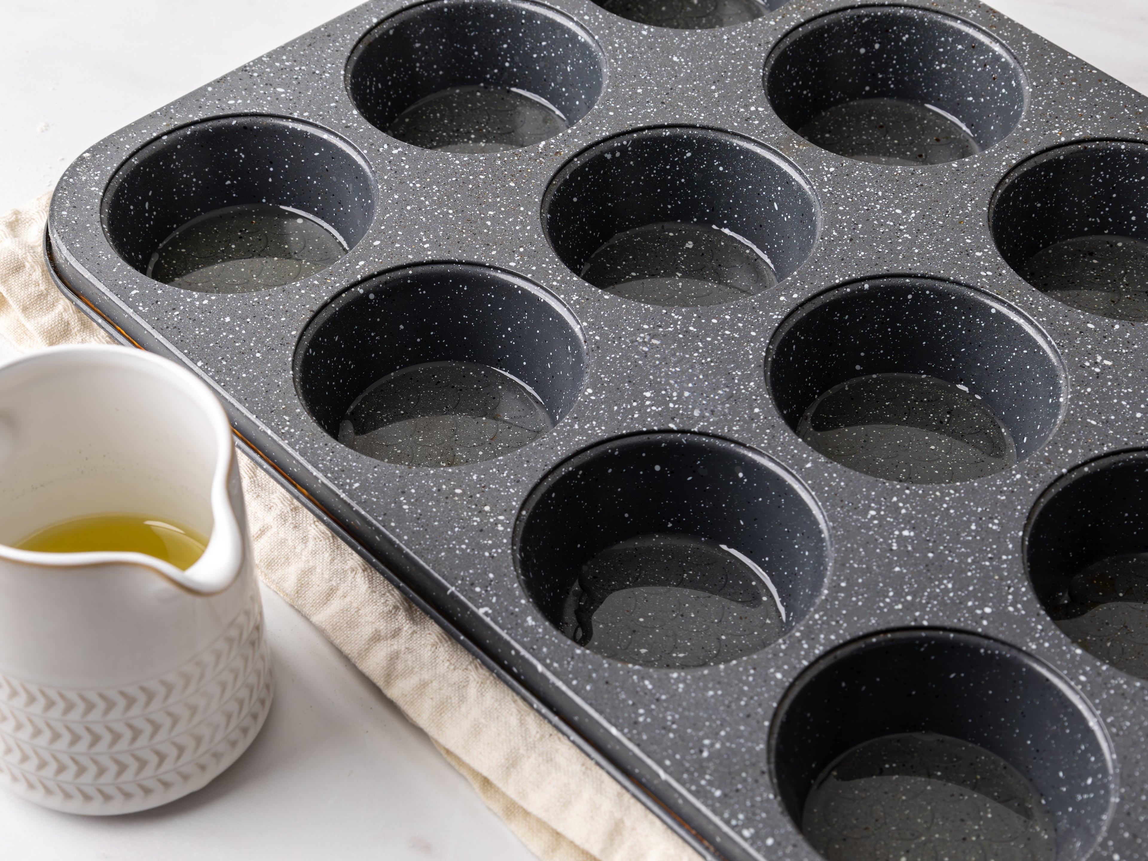 Drizzle enough sunflower oil to cover the bottom of each hole of your tin.